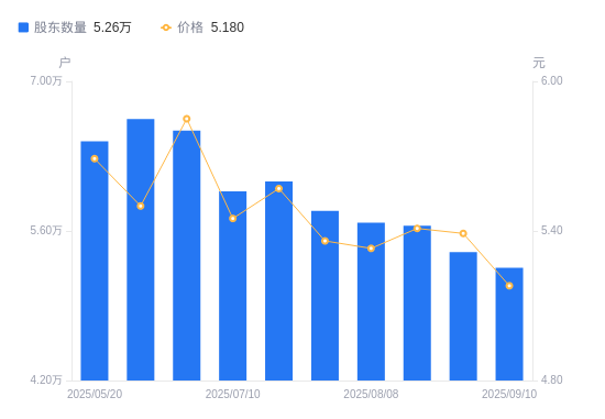 近一年(2024年9月20日至2025年9月10日),安诺其A股股东户数从6.42万户,减低至5.26万户,降幅18.10%,区间股价上涨34.20%。