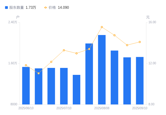 近一年(2024年9月30日至2025年9月10日),启迪设计A股股东户数从1.7万户,增加至1.73万户,增幅1.37%,区间股价上涨33.18%。