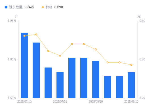 近一年(2024年9月10日至2025年9月10日),宿迁联盛A股股东户数从1.4万户,增加至1.74万户,增幅24.04%,区间股价上涨23.77%。