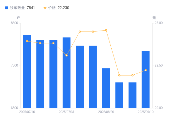 9月11日消息,数据显示,截至2025年9月10日,超越科技A股股东总户数为7841户,较上期(2025年8月31日)增加737户,增幅10.37%。公司最新A股总股本为9425.33万股,其中流通A股4282.64万股,户均持有流通A股数量为5461.85股,较上期减少566.64股,降幅9.40%;户均持流通A股市值12.14万元,较上期减少1.08万元,降幅8.16%。