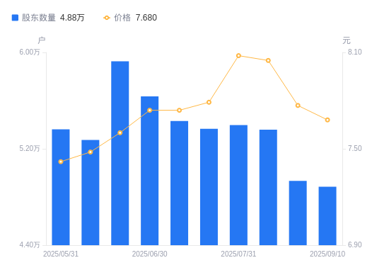 近一年(2024年9月10日至2025年9月10日),鲁北化工A股股东户数从6.26万户,减低至4.88万户,降幅22.00%,区间股价上涨26.11%。