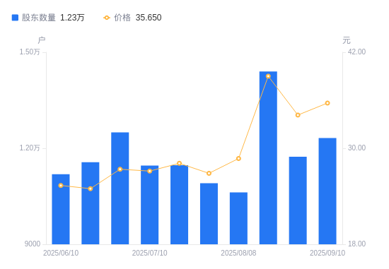 近一年(2024年9月20日至2025年9月10日),祥明智能A股股东户数从1.2万户,增加至1.23万户,增幅3.00%,区间股价上涨109.21%。