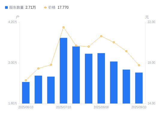 近一年(2024年9月10日至2025年9月10日),中船汉光A股股东户数从2.91万户,减低至2.71万户,降幅6.69%,区间股价上涨28.08%。