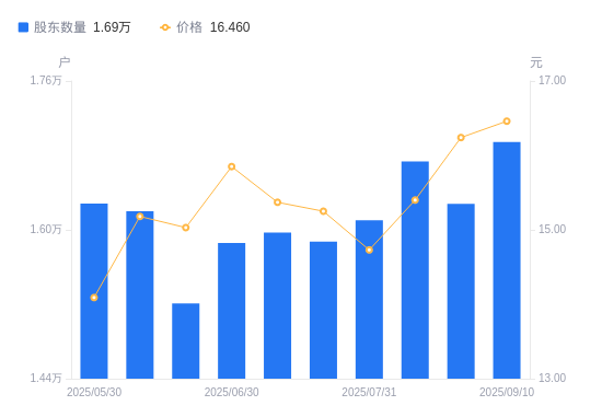 近一年(2024年9月20日至2025年9月10日),奥联电子A股股东户数从2.52万户,减低至1.69万户,降幅32.83%,区间股价上涨48.02%。