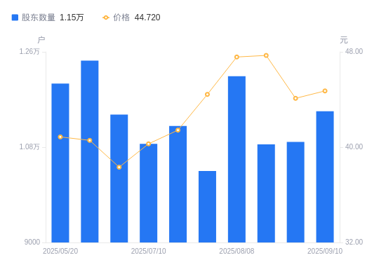 近一年(2024年9月20日至2025年9月10日),肯特股份A股股东户数从1.13万户,增加至1.15万户,增幅1.79%,区间股价上涨59.32%。