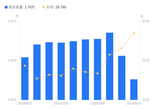 近一年(2024年9月10日至2025年9月10日),鸿合科技A股股东户数从1.57万户,增加至1.76万户,增幅12.00%,区间股价上涨44.08%。