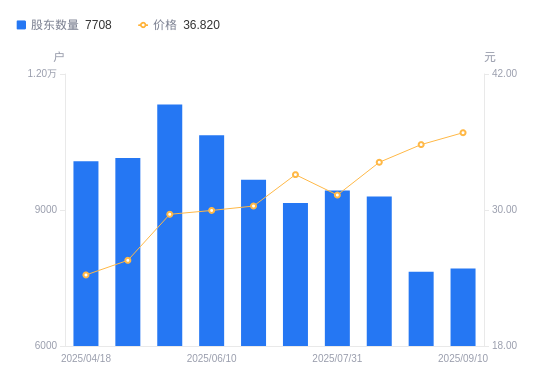 近一年(2024年9月10日至2025年9月10日),江苏博云A股股东户数从7809户,减低至7708户,降幅1.29%,区间股价上涨118.58%。