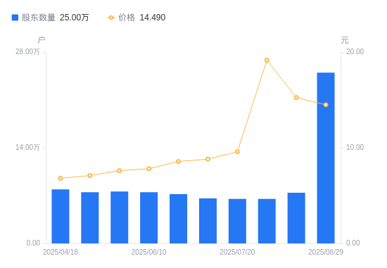近一年(2024年8月31日至2025年8月29日),西藏天路A股股东户数从10.6万户,增加至25万户,增幅135.79%,区间股价上涨155.56%。