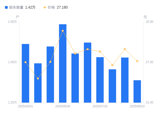 9月11日消息,数据显示,截至2025年9月10日,江天化学A股股东总户数为1.42万户,较上期(2025年8月20日)减少2244户,降幅13.63%。公司最新A股总股本为1.44亿股,其中流通A股1.41亿股,户均持有流通A股数量为9905.01股,较上期增加1349.7股,增幅15.78%;户均持流通A股市值26.92万元,较上期增加2.15万元,增幅8.70%。