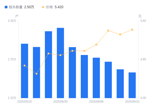 近一年(2024年9月10日至2025年9月10日),永利股份A股股东户数从2.19万户,增加至2.5万户,增幅13.91%,区间股价上涨74.00%。