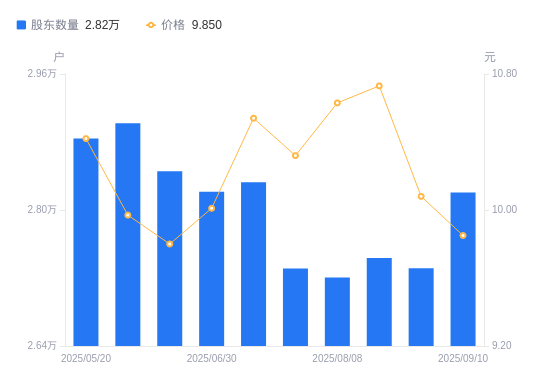 近一年(2024年9月30日至2025年9月10日),克明食品A股股东户数从3.18万户,减低至2.82万户,降幅11.28%,区间股价上涨13.53%。