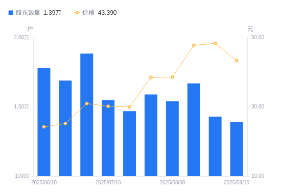 近一年(2024年9月10日至2025年9月10日),德迈仕A股股东户数从2.32万户,减低至1.39万户,降幅40.09%,区间股价上涨276.65%。