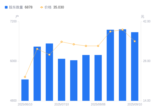 9月11日消息,数据显示,截至2025年9月10日,金橙子A股股东总户数为6878户,较上期(2025年8月29日)减少89户,降幅1.28%。公司最新A股总股本为1.03亿股,其中流通A股3366.67万股,户均持有流通A股数量为4894.84股,较上期增加62.53股,增幅1.29%;户均持流通A股市值17.15万元,较上期减少1.76万元,降幅9.32%。