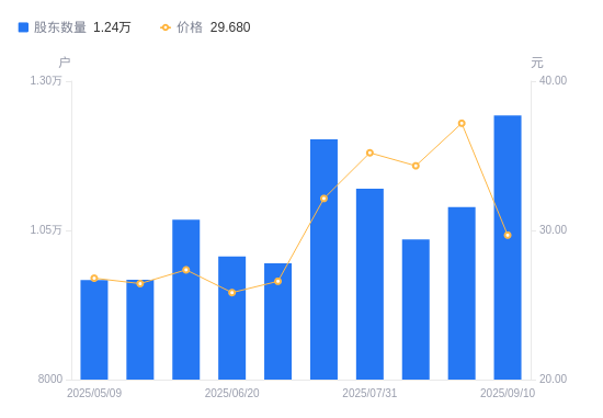 近一年(2024年9月10日至2025年9月10日),凯因科技A股股东户数从7318户,增加至1.24万户,增幅69.79%,区间股价上涨46.81%。