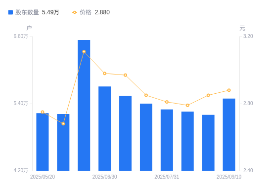 近一年(2024年9月30日至2025年9月10日),中锐股份A股股东户数从6.11万户,减低至5.49万户,降幅10.06%,区间股价上涨33.33%。