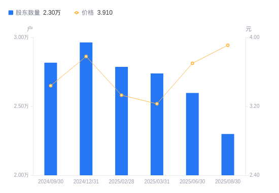 近一年(2024年9月30日至2025年8月30日),凤凰股份A股股东户数从2.82万户,减低至2.3万户,降幅18.36%,区间股价上涨23.73%。