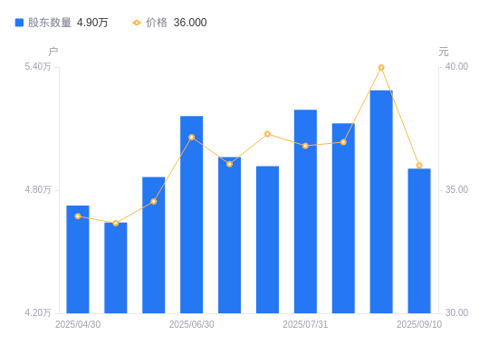 近一年(2024年9月10日至2025年9月10日),容大感光A股股东户数从5.53万户,减低至4.9万户,降幅11.26%,区间股价上涨35.34%。