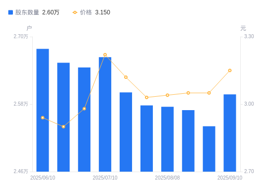 近一年(2024年9月10日至2025年9月10日),顺发恒能A股股东户数从3.11万户,减低至2.6万户,降幅16.54%,区间股价上涨41.89%。