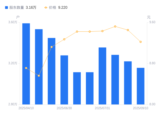近一年(2024年9月10日至2025年9月10日),甘咨询A股股东户数从3.36万户,减低至3.16万户,降幅5.94%,区间股价上涨34.99%。