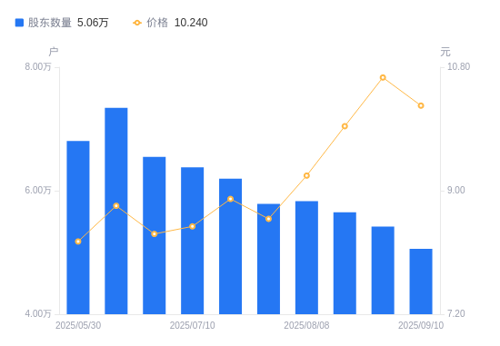 近一年(2024年9月10日至2025年9月10日),中原内配A股股东户数从5.15万户,减低至5.06万户,降幅1.74%,区间股价上涨95.42%。