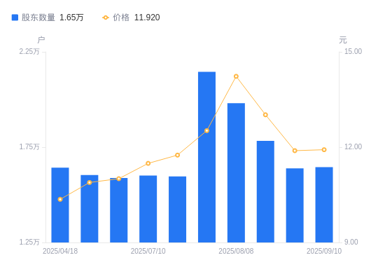近一年(2024年9月30日至2025年9月10日),达嘉维康A股股东户数从1.57万户,增加至1.65万户,增幅4.79%,区间股价上涨20.79%。