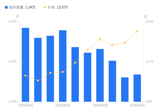 近一年(2024年9月10日至2025年9月10日),美能能源A股股东户数从1.75万户,减低至1.34万户,降幅23.54%,区间股价上涨66.45%。