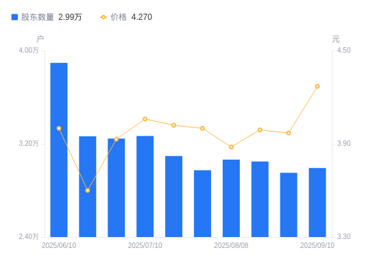 近一年(2024年9月30日至2025年8月29日),海泰发展A股股东户数从3.42万户,减低至2.95万户,降幅13.77%,区间股价上涨54.47%。