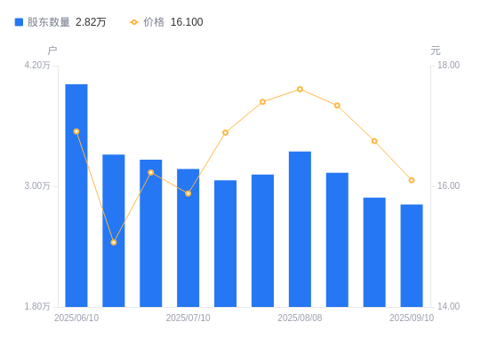 近一年(2024年9月30日至2025年9月10日),冠昊生物A股股东户数从3.33万户,减低至2.82万户,降幅15.30%,区间股价上涨43.49%。