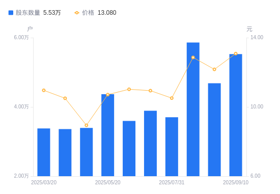 近一年(2024年9月10日至2025年9月10日),山东章鼓A股股东户数从3.59万户,增加至5.53万户,增幅53.82%,区间股价上涨86.59%。