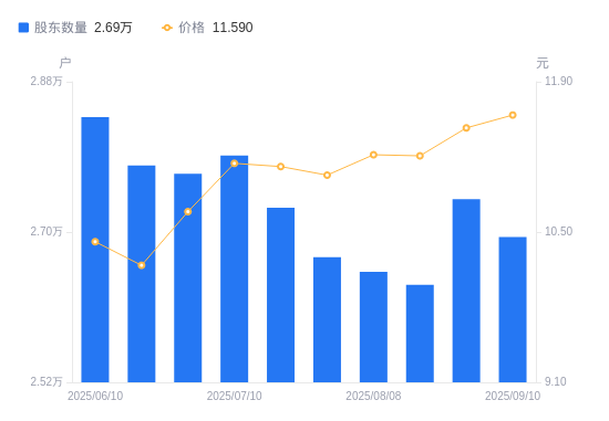 近一年(2024年9月10日至2025年9月10日),东莞控股A股股东户数从3.37万户,减低至2.69万户,降幅19.97%,区间股价上涨39.22%。