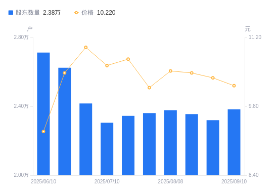 近一年(2024年9月10日至2025年9月10日),渤海轮渡A股股东户数从2.33万户,增加至2.38万户,增幅2.34%,区间股价上涨63.00%。