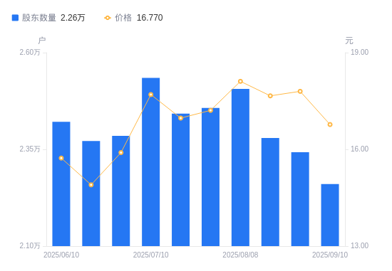 近一年(2024年9月10日至2025年9月10日),中铁装配A股股东户数从2.57万户,减低至2.26万户,降幅12.12%,区间股价上涨23.49%。