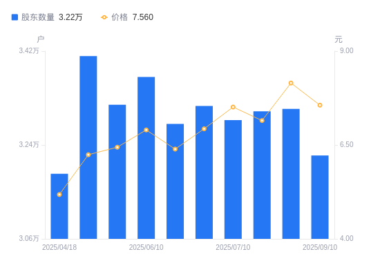 9月12日消息,数据显示,截至2025年9月10日,金能科技A股股东总户数为3.22万户,较上期(2025年8月20日)减少893户,降幅2.70%。公司最新A股总股本为8.48亿股,其中流通A股8.48亿股,户均持有流通A股数量为2.63万股,较上期增加710.65股,增幅2.77%;户均持流通A股市值19.91万元,较上期减少9745.68元,降幅4.67%。