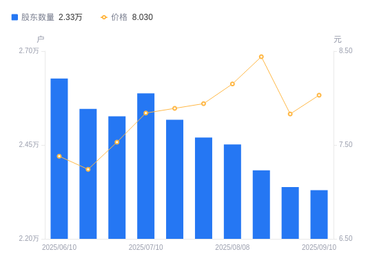 近一年(2024年9月10日至2025年9月10日),华润材料A股股东户数从3.26万户,减低至2.33万户,降幅28.54%,区间股价上涨46.53%。