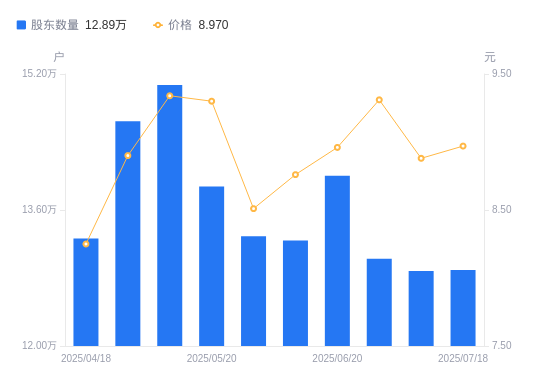 9月9日消息,数据显示,截至2025年8月8日,卓翼科技(维权)A股股东总户数为12.5万户,较上期(2025年7月31日)减少319户,降幅0.25%。公司最新A股总股本为5.67亿股,其中流通A股5.66亿股,户均持有流通A股数量为4529.9股,较上期增加11.53股,增幅0.26%;户均持流通A股市值4.09万元,较上期增加1007.69元,增幅2.53%。