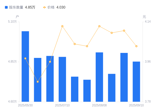 近一年(2024年9月20日至2025年9月10日),浙江交科A股股东户数从5.33万户,减低至4.85万户,降幅8.97%,区间股价上涨24.19%。