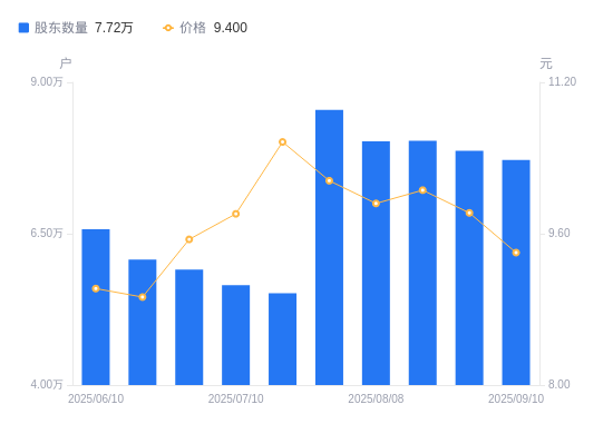 近一年(2024年9月10日至2025年9月10日),海南发展A股股东户数从5.39万户,增加至7.72万户,增幅43.14%,区间股价上涨59.59%。