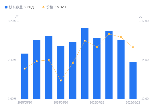 近一年(2024年8月30日至2025年8月29日),泰永长征A股股东户数从2.39万户,减低至2.36万户,降幅1.46%,区间股价上涨47.45%。