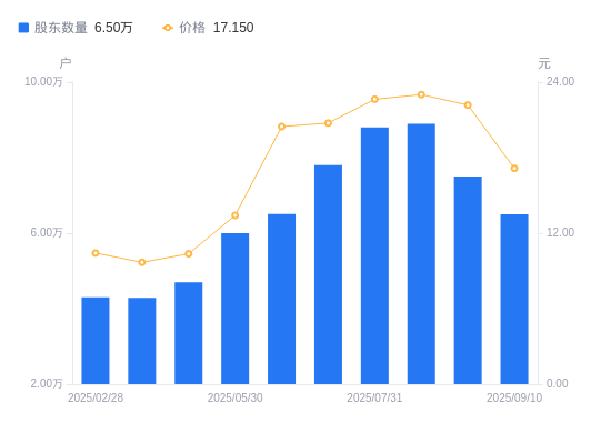 近一年(2024年9月30日至2025年9月10日),晨曦航空A股股东户数从3.74万户,增加至6.5万户,增幅73.75%,区间股价上涨114.37%。