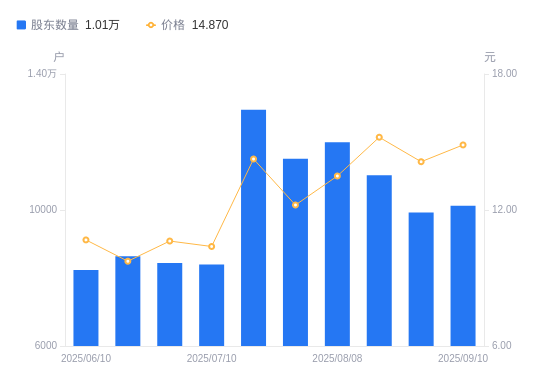 近一年(2024年9月20日至2025年9月10日),博汇股份A股股东户数从1.03万户,减低至1.01万户,降幅1.38%,区间股价上涨152.03%。