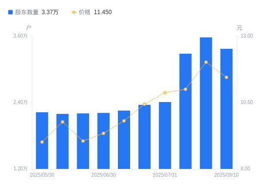 近一年(2024年9月10日至2025年9月10日),新天药业A股股东户数从2.2万户,增加至3.37万户,增幅53.12%,区间股价上涨46.91%。