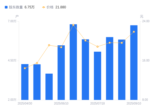 近一年(2024年9月20日至2025年9月10日),元隆雅图A股股东户数从2.7万户,增加至6.75万户,增幅150.47%,区间股价上涨118.58%。