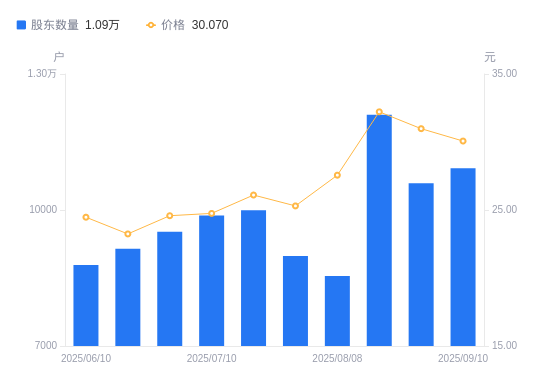 近一年(2024年9月10日至2025年9月10日),标榜股份A股股东户数从8817户,增加至1.09万户,增幅23.84%,区间股价上涨66.96%。