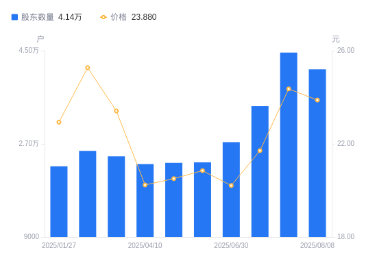 近一年(2024年9月30日至2025年8月29日),竞业达A股股东户数从2.55万户,增加至3.36万户,增幅31.76%,区间股价上涨28.25%。