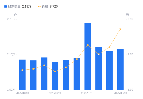近一年(2024年9月30日至2025年9月10日),中新集团A股股东户数从2.06万户,增加至2.19万户,增幅6.20%,区间股价上涨18.45%。