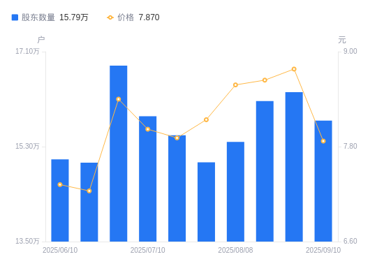 近一年(2024年9月10日至2025年9月10日),航天发展A股股东户数从16.57万户,减低至15.79万户,降幅4.67%,区间股价上涨28.18%。