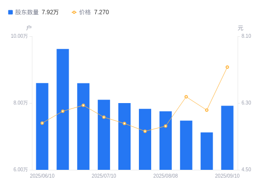 9月12日消息,数据显示,截至2025年9月10日,宝馨科技A股股东总户数为7.92万户,较上期(2025年8月29日)增加7972户,增幅11.20%。公司最新A股总股本为7.2亿股,其中流通A股5.54亿股,户均持有流通A股数量为6997.68股,较上期减少783.48股,降幅10.07%;户均持流通A股市值5.09万元,较上期增加3330.23元,增幅7.00%。