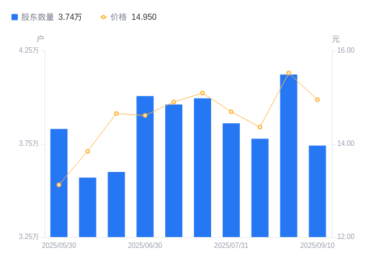 近一年(2024年9月10日至2025年9月10日),皇台酒业A股股东户数从3.12万户,增加至3.74万户,增幅19.76%,区间股价上涨80.12%。