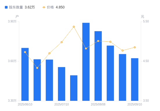 近一年(2024年9月10日至2025年9月10日),欣龙控股A股股东户数从3.81万户,减低至3.62万户,降幅5.04%,区间股价上涨58.50%。
