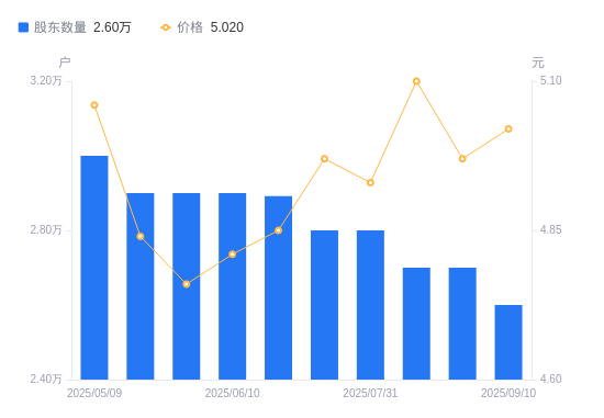 近一年(2024年9月10日至2025年9月10日),绿城水务A股股东户数从3.2万户,减低至2.6万户,降幅18.75%,区间股价上涨24.26%。